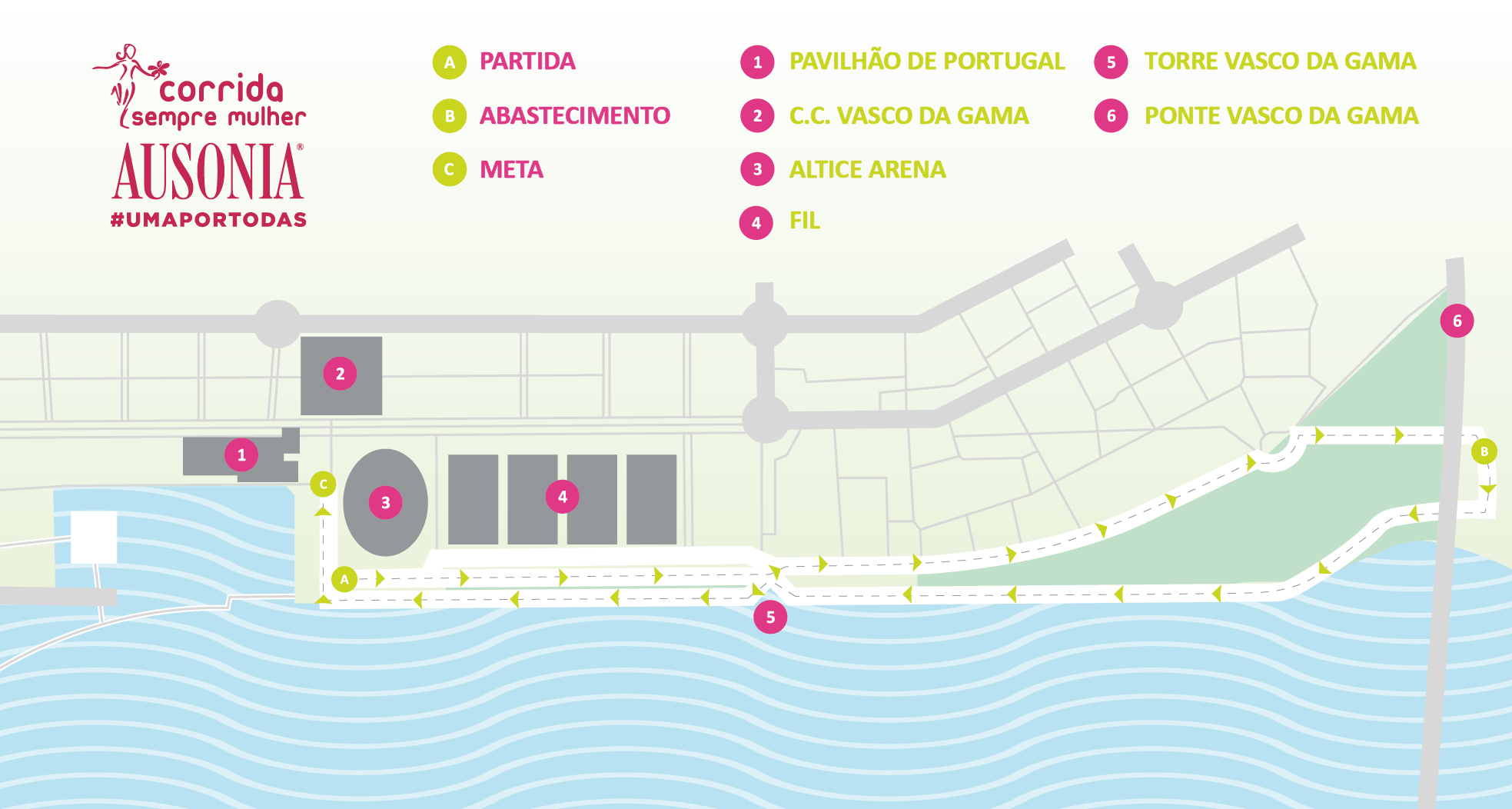 Percurso único na distância de 5km com partida e chegada em local próximo das traseiras do Centro Comercial Vasco da Gama.